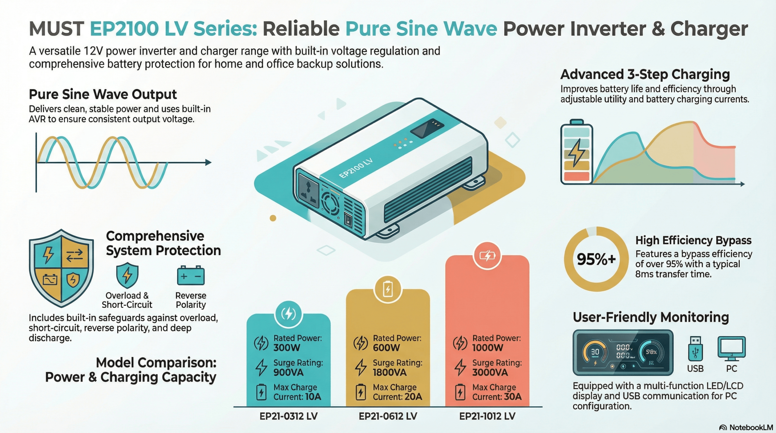3x Surge Capability: The heavy-duty transformer design provides a peak surge of up to 3000VA (1000W model), allowing it to start demanding loads like small fridges, pumps, and power tools.