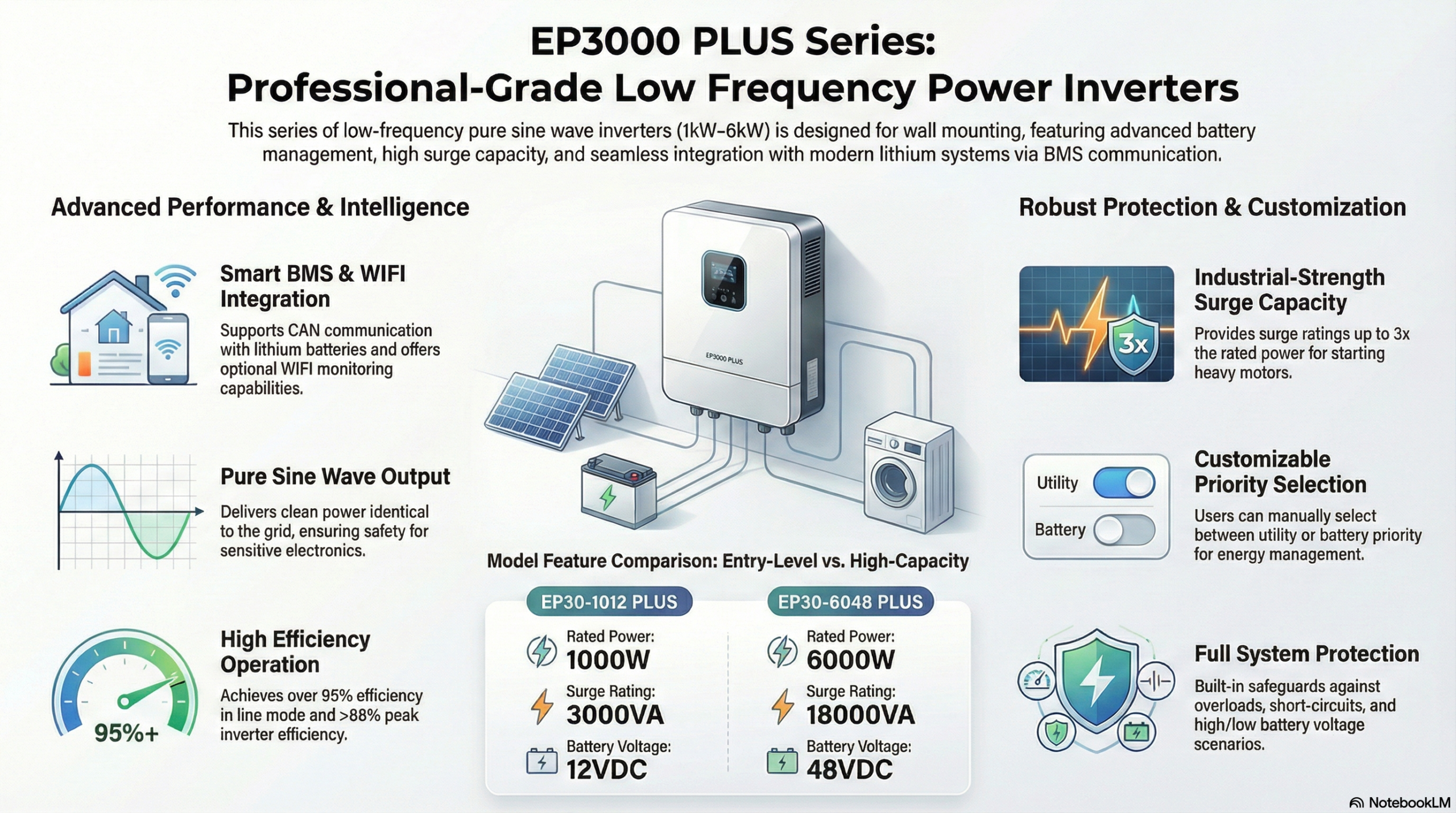 The EP3000 PLUS Series is a heavy-duty Low Frequency Inverter/Charger designed for the most demanding off-grid power needs. Built with a robust Copper Transformer, it offers an impressive 3x Surge Capability, making it effortless to start heavy inductive loads like air conditioners, water pumps, and freezers. Unlike traditional low-frequency inverters, the PLUS series is modernized with BMS Communication (CAN port) for Lithium batteries and features a Selectable Output Voltage (220/230/240V), combining rugged reliability with smart control.