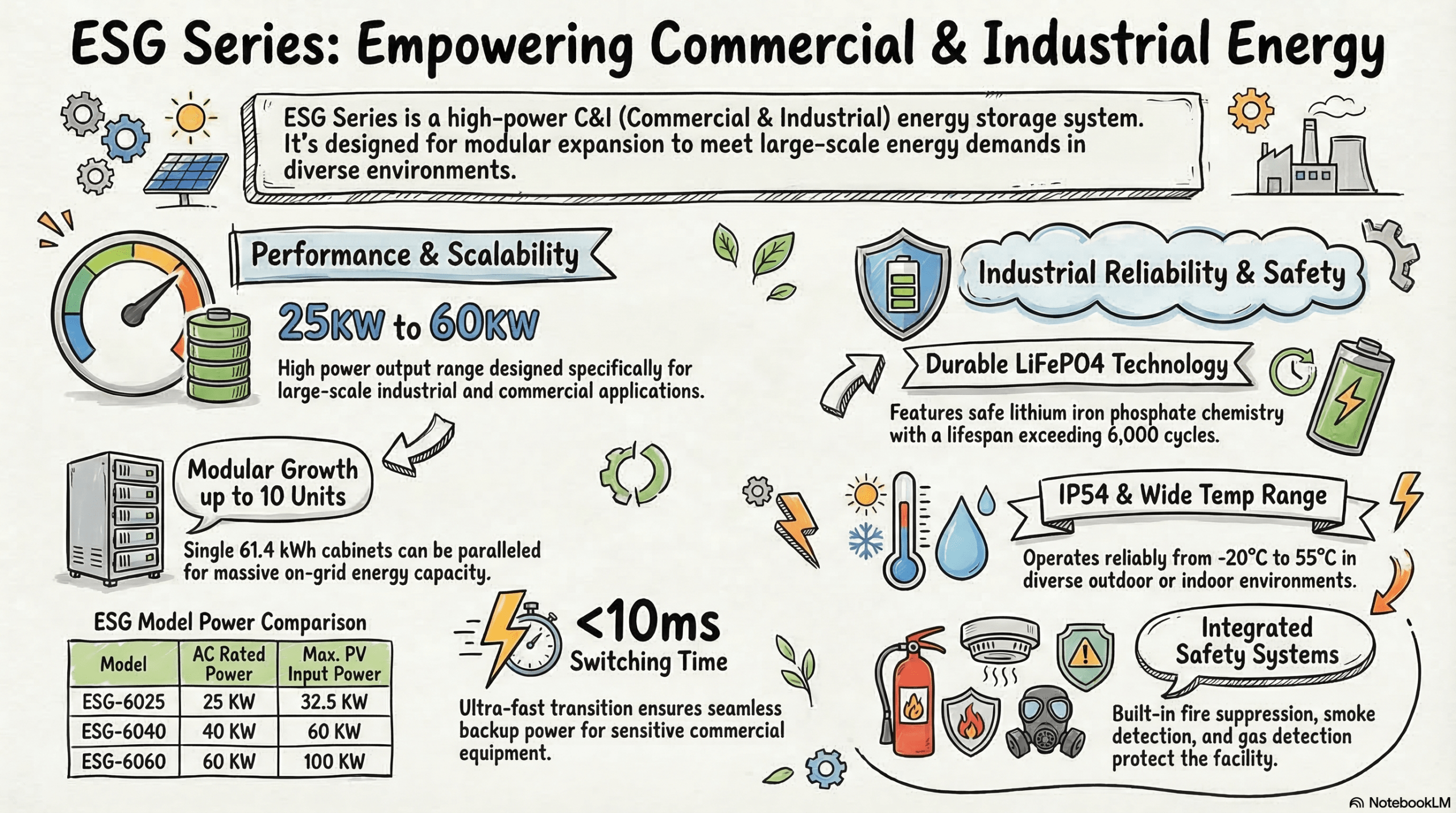 Massive C&I Scalability: Built to grow with your business. The system supports parallel expansion of up to 4 units in off-grid mode and up to 10 units in on-grid mode, enabling a total scalable capacity of over 600kWh.