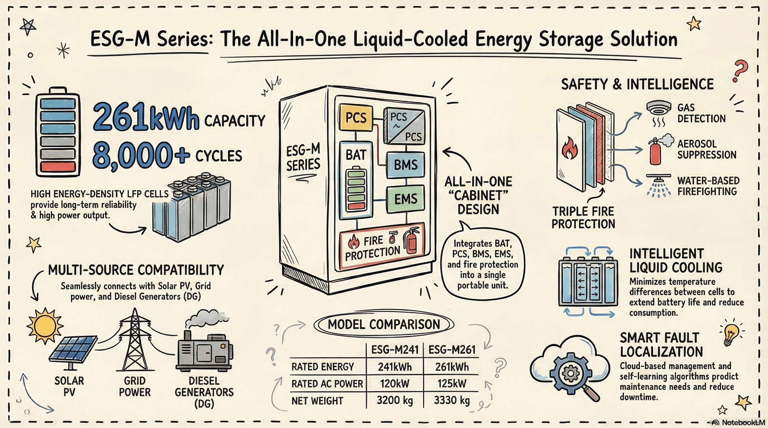 Massive Output & Capacity: Powered by next-generation 314Ah cells. The ESG-M241 offers 120kW / 241kWh, while the ESG-M261 provides 125kW / 261kWh. Designed for heavy 0.5C charge/discharge rates.