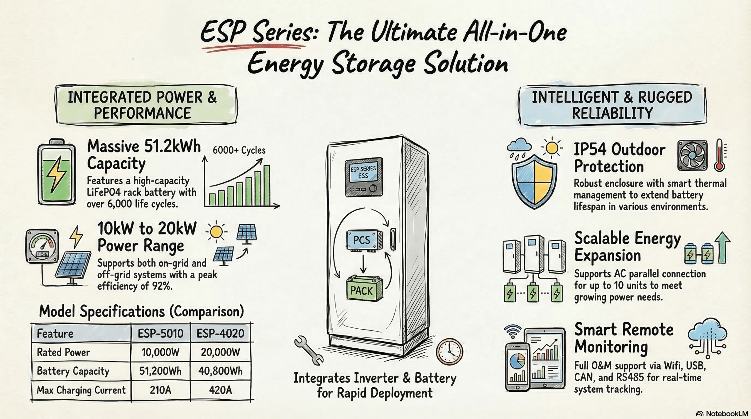 Massive Built-in Capacity: Equipped with high-grade 51.2V 200Ah LiFePO4 modules. The ESP-5010 offers a staggering 51.2kWh, while the ESP-4020 delivers 40.8kWh of energy, providing days of backup power for a standard home during grid outages.