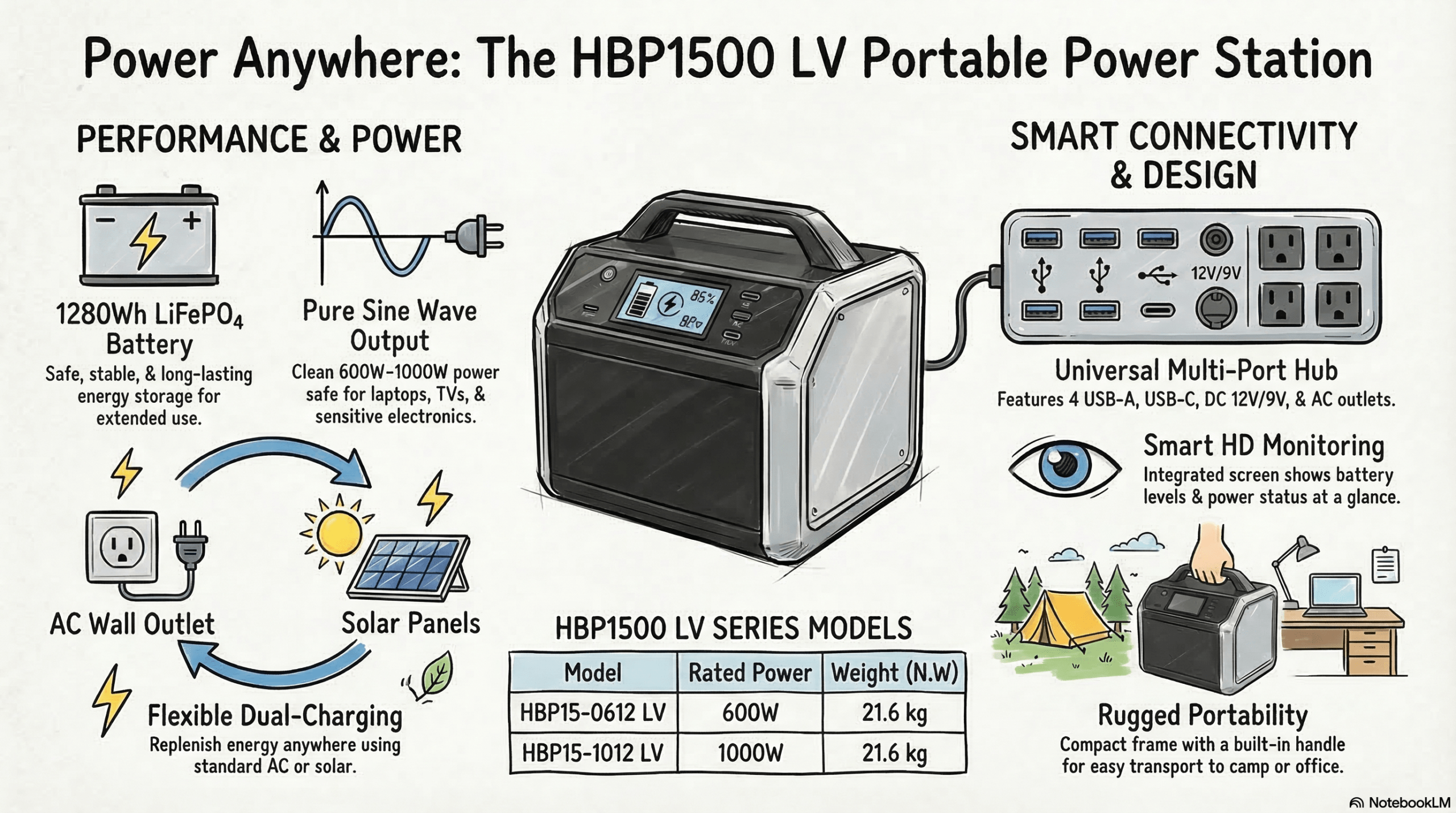The HBP1500 LV Series is a robust and compact Portable Solar Power Station specifically engineered for regions utilizing 120V power standards. Designed to provide clean and reliable energy for off-grid adventures and essential home backup, it delivers premium 120V Pure Sine Wave AC output (available in 600W and 1000W models). This ensures your sensitive electronics and essential appliances run safely and efficiently. Packed with a highly durable 1280Wh LiFePO4 battery and featuring an ultra-fast typical transfer time of under 10ms, it serves as a dependable uninterrupted power supply (UPS). With versatile charging options, including high-speed 40A AC charging and up to 600W solar input, the HBP1500 LV keeps you powered up in any situation.