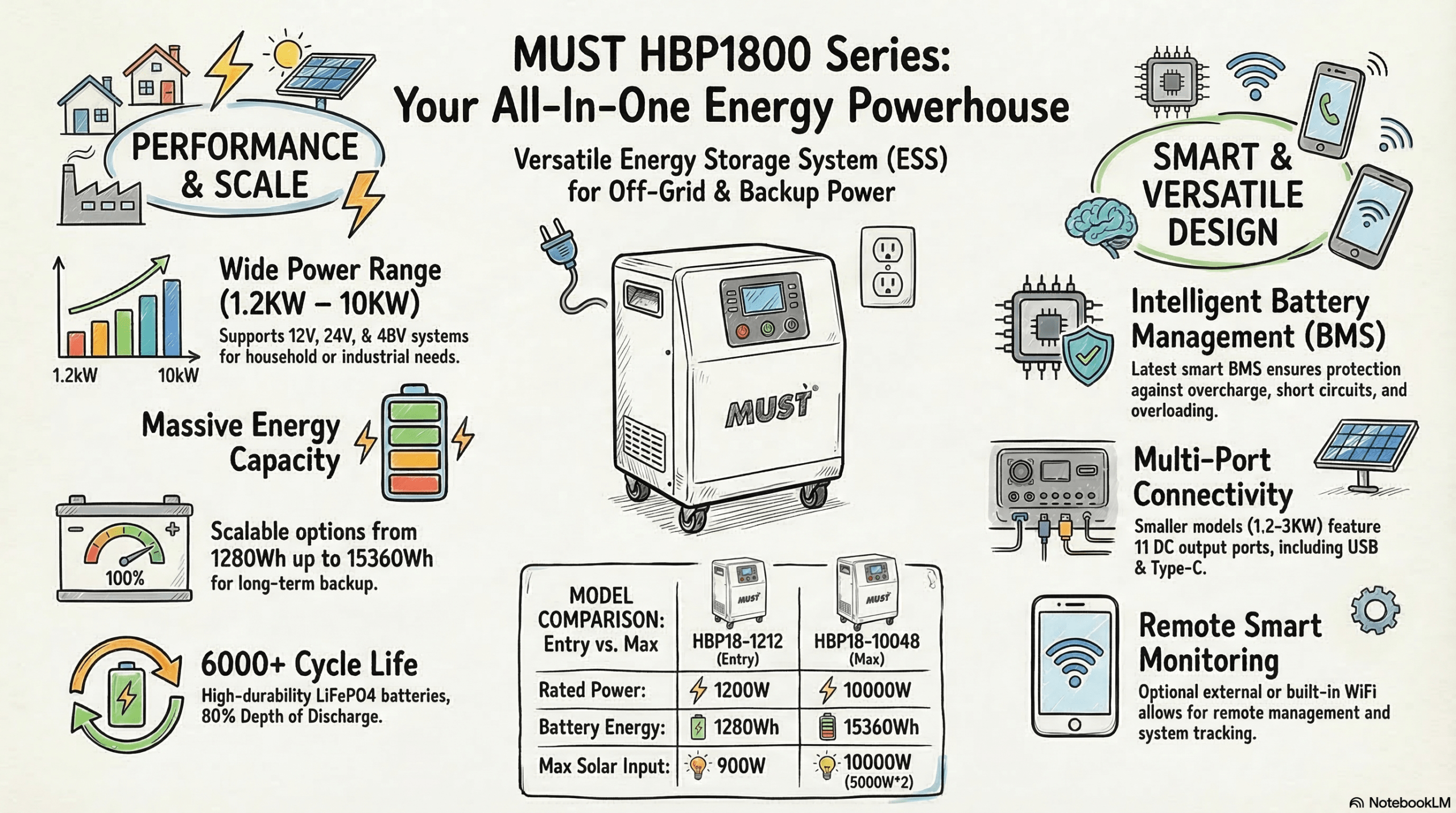 Comprehensive Power Range: Whether you need 1.2KW to keep the lights and fridge on, or a massive 10KW inverter to run heavy air conditioners and whole-house circuits, the HBP1800 series has a configuration tailored for you (offering 230V Pure Sine Wave output).