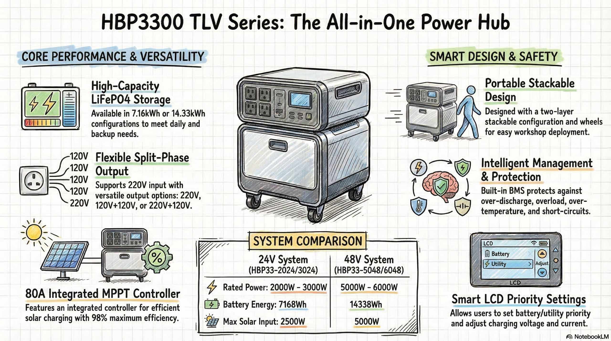 Modular Stackable Architecture: The inverter and battery modules feature a space-saving, stackable design. This allows for a clean, unified tower installation in your garage or utility room while making transport and deployment significantly easier than traditional heavy cabinets.