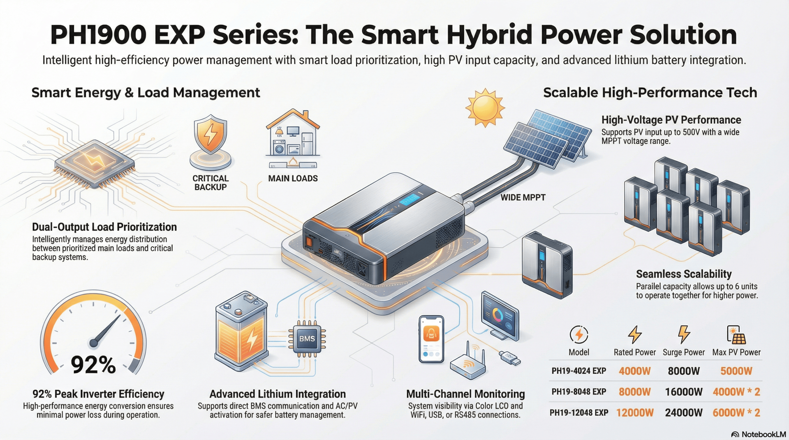Scalable System: Supports parallel connection of up to 6 units, allowing for system expansion up to 72KW (single or three-phase configuration).