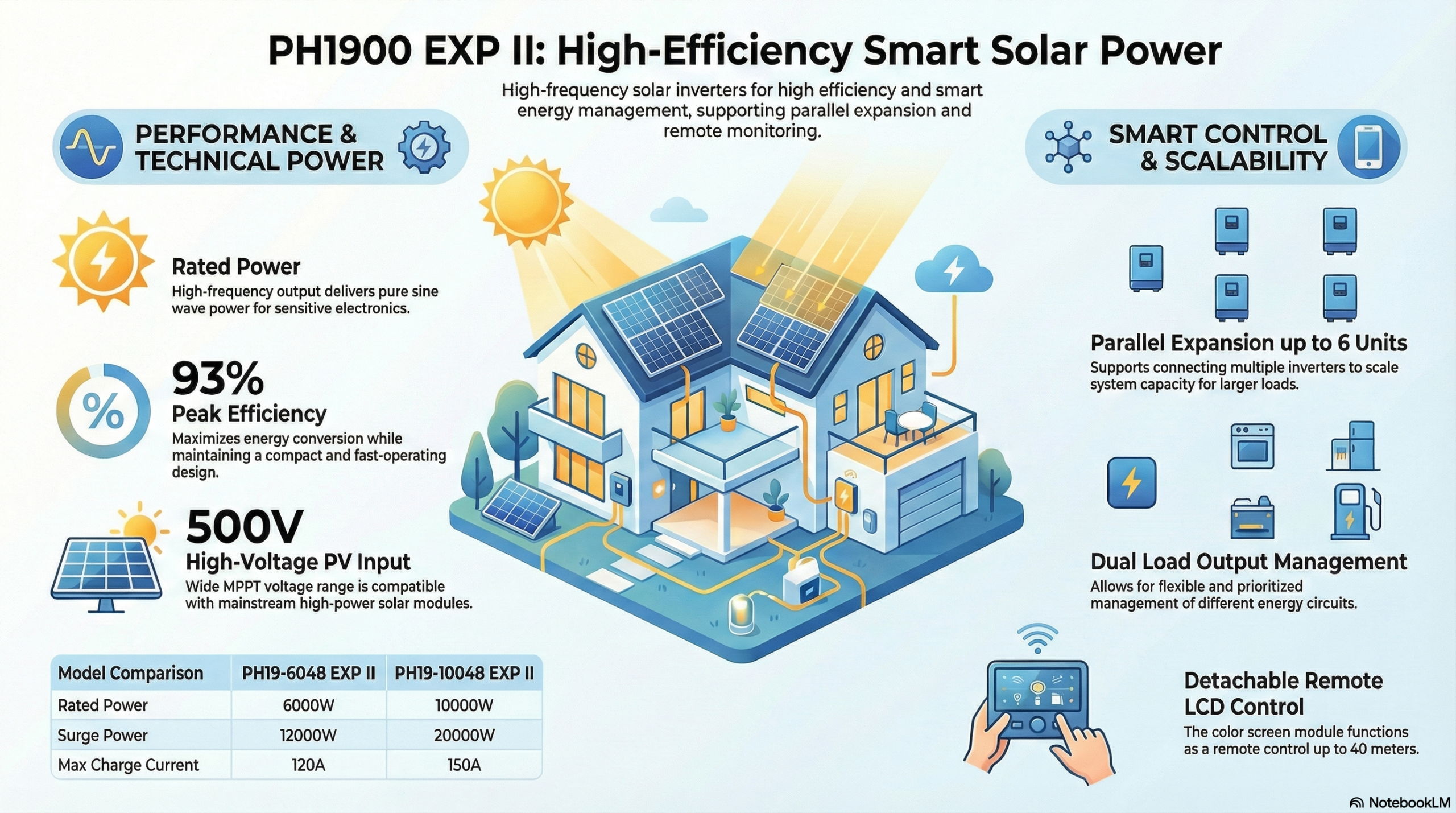 High-Power PV Input (10KW Model): The 10KW model is optimized for high-yield systems, featuring Dual MPPT with a massive 13,000W (6500W x 2) PV input capacity to maximize solar utilization.
