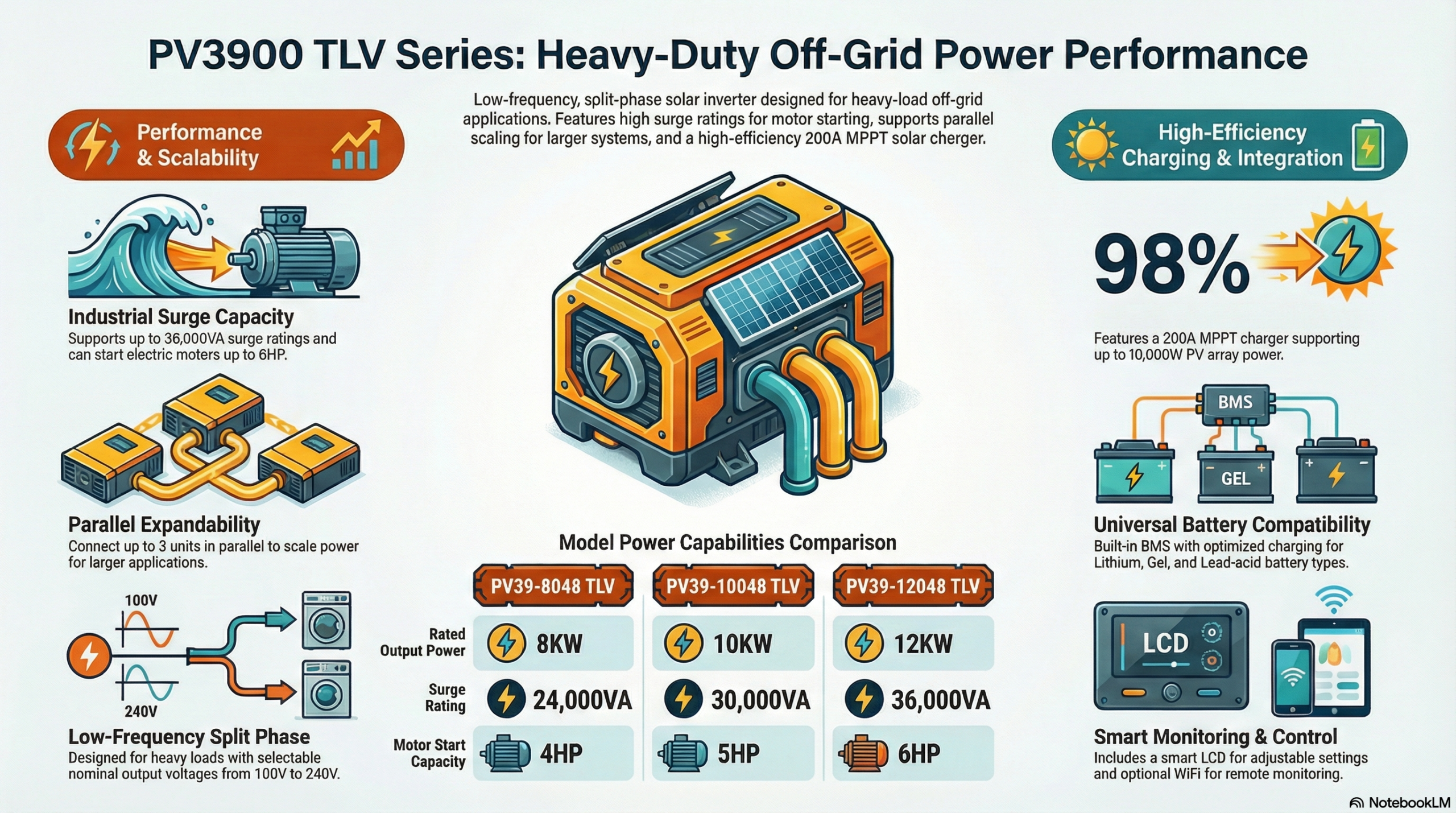 The PV3900 TLV Series is a specialized Low Frequency Split Phase Inverter designed for markets requiring 110V/120V or 120V/240V dual-voltage power, such as North America. Built with a massive copper transformer, it provides unmatched stability and surge capability (300%) to start heavy inductive loads like central air conditioners, pumps, and motors. With a built-in 200A MPPT solar charger capable of handling 10,000W of PV power, it is the ultimate rugged power solution for large off-grid homes, cabins, and workshops.
