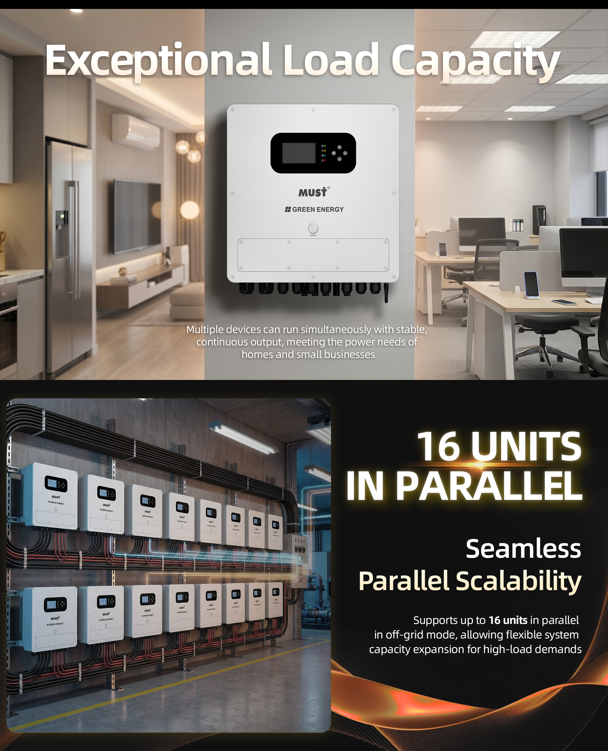 - Flexible System Expansion: Allows up to 16 units parallel connection for greater power scalability in off-grid setups.